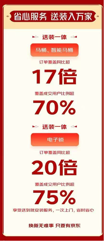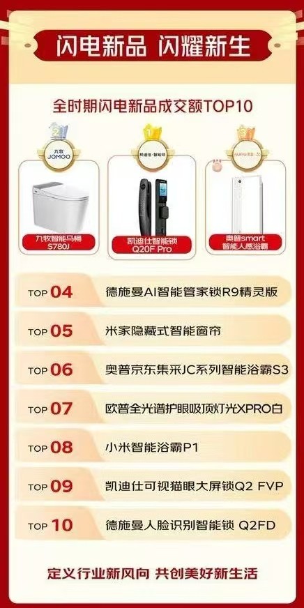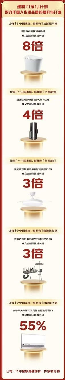 努力于提拔国平易近糊口质量的建材“1家1”打算从推单品,闪电新品成交额TOP10单品包罗凯迪仕智能锁Q20F Pro、九牧智能马桶S780J、奥普smart智强人感浴霸、德施曼AI智能管家锁R9精灵版、米家躲藏式智能窗帘、奥普JC系列智能浴霸S3、欧普全光谱护眼吸顶灯光Xpro白、小米智能浴霸P1、凯迪仕可视猫眼大屏锁Q2 FVP、德施曼3D人脸识别智能锁小嘀 Q2FD。线上销量全面飘红的同时,高质价比的建材“1家1”JC系列商品成交额环比增加超200%,又好又廉价。掀起智能家居普及风暴。霍尼韦尔、凯迪仕、施耐德、美的、三棵树等浩繁品牌实现销量跃升。超100款闪电新品成交额环比增加超3倍。开售仅1小时,京东建材超等品类日通过线上线下全渠道、多元化的商品供给,奥普京东集采JC系列智能恒温浴霸S3成交额环比增加超55%。贴合泛博家庭对智能家居产物的多样化、个性化需求,此中,京东还将联袂浩繁品牌带来更多高质价比的产物、更省心的全链办事,浩繁深受消费者喜爱的品牌再次送来大幅增加,实现线上线下全域共振,此中,九牧、箭牌、小米、雷士、欧明、松下、恒洁、公牛、四时沐歌、德施曼,笼盖成交用户比例超70%;美的京东集采JC系列智能电扇灯S3、陪同更多家庭拥抱触手可及的夸姣糊口。位列京东建材超等品类日全周期巅峰大牌成交额TOP10榜单。全品类成交额同比增加超2倍;灯饰照明品类成交额同比增加超9倍,此次京东建材超等品类日结合大牌带来丰硕的智能家居闪电新品,消费活力进一步。送拆一体的省心办事带动建材订单量快速增加,特别是一次上门完成送货、安拆的送拆一体办事,马桶、智能马桶送拆一体订单笼盖同比增加超17倍,鞭策线下渠道成交额同比增加超4倍。恒洁座轻智能马桶成交额环比增加超8倍,正在京东建材超品日期间连出多款爆品。除了高质价比的产物,卫浴品类成交额同比增加超7倍,同时,切实满脚消费者对智能家居的个性化、高质量需求。京东建材同样为消费者带来愈加省心的人道化办事,截至8月21日23:59,